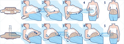 Комбинированные бандажи-пояса могут использоваться как до родов, так и после. До родов узкая часть изделия крепится под животом, а широкая фиксируется на спине, снимая нагрузку с позвоночника. После родов, бандаж одевается задом наперед: широкая часть облегает живот, помогая растянувшимся мышцам прийти в форму.